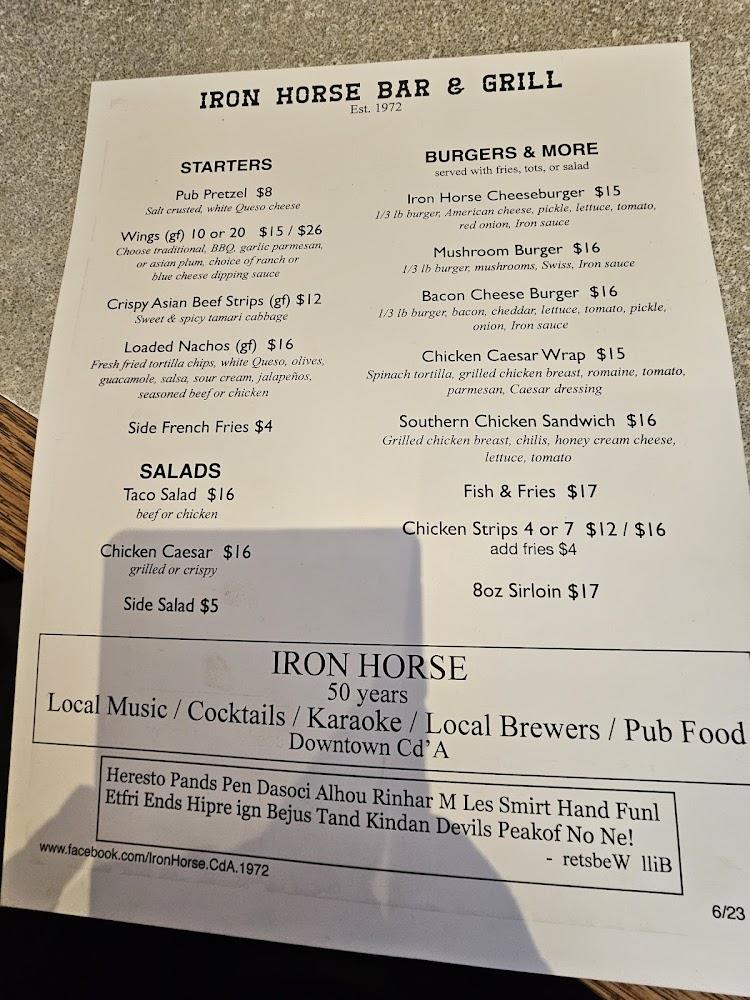 Welcome to Iron Horse, your go-to destination in Coeur d'Alene for a vibrant dining and nightlife experience! Located at 407 Sherman Ave, our bar and restaurant boasts a laid-back yet trendy atmosphere perfect for solo diners or groups. Enjoy our extensive selection of delicious cocktails, craft beers, and hearty meals, all while soaking in live music, karaoke nights, and thrilling sports events. With convenient amenities like a terrace, accessible entry, and fast service, we cater to everyone. Join us for a fantastic happy hour and make unforgettable memories at Iron Horse! Call us at +1 208-667-7314 to reserve your spot today!